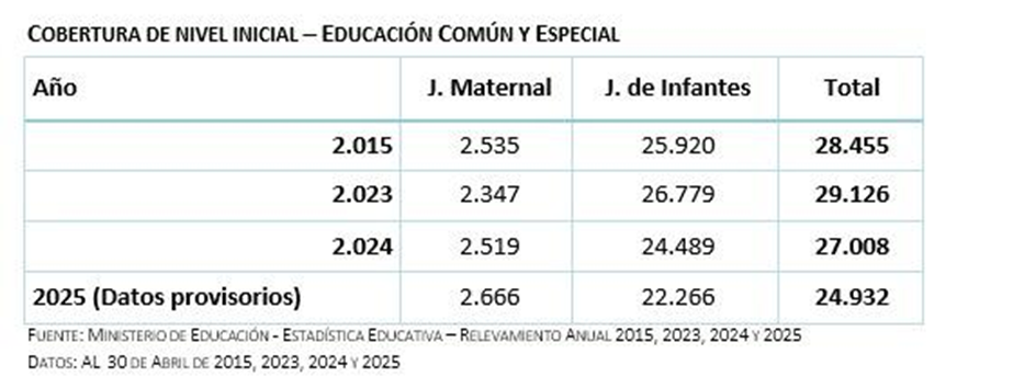 Entre 2010 y 2020 la natalidad cayó 7,3% (del 19,2% al 11,9%), lo que redujo la cantidad de niños/as; aun así, la escolarización aumentó. Este crecimiento se explica por la creación de nuevos jardines con las inversiones del PROMACE, lo que permitió también la designación de más cargos docentes y no docentes.