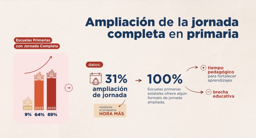 Es decir, el 100% de las escuelasprimarias estatales ofrece algún formato de jornada ampliada, lo que garantiza más tiempo pedagógico para fortalecer aprendizajes y reducir brechas.