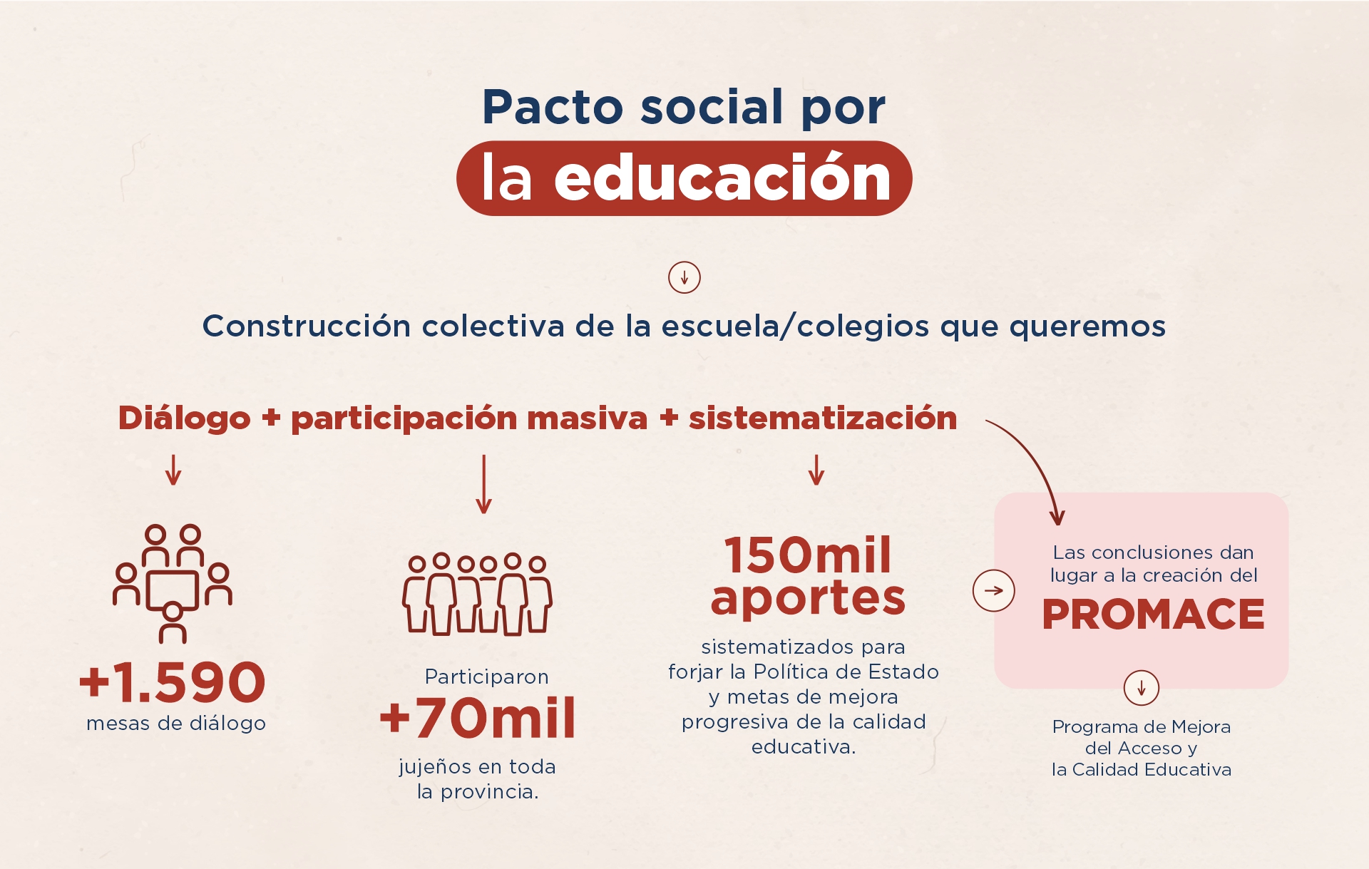 Las conclusiones, a partir de todos los aportes, generaron la creación del PROMACE que dio respuestas a temas críticos como infraestructura escolar, formación docente, conectividad y TICs, educación en valores, ampliación de la jornada en las escuelas, fortalecimiento de trayectorias educativas y la responsabilidad social compartida sobre la escuela.