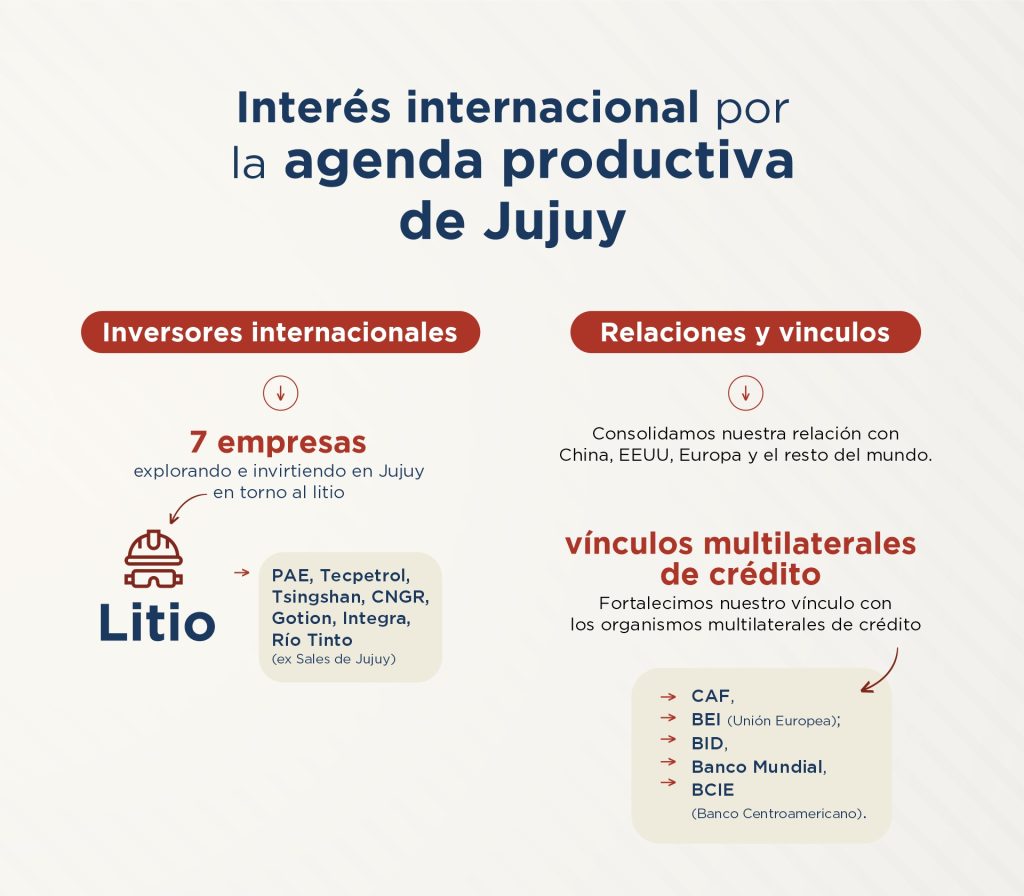 Siete empresas se encuentran explorando e invirtiendo en Jujuy en torno al litio: PAE, Tecpetrol, Tsingshan, CNGR, Gotion, Integra y Río Tinto(ex Sales de Jujuy), esta última con la posibilidad de explorar y explotar no solo en litio, sino en el cobre, como empresa número uno del mundo.