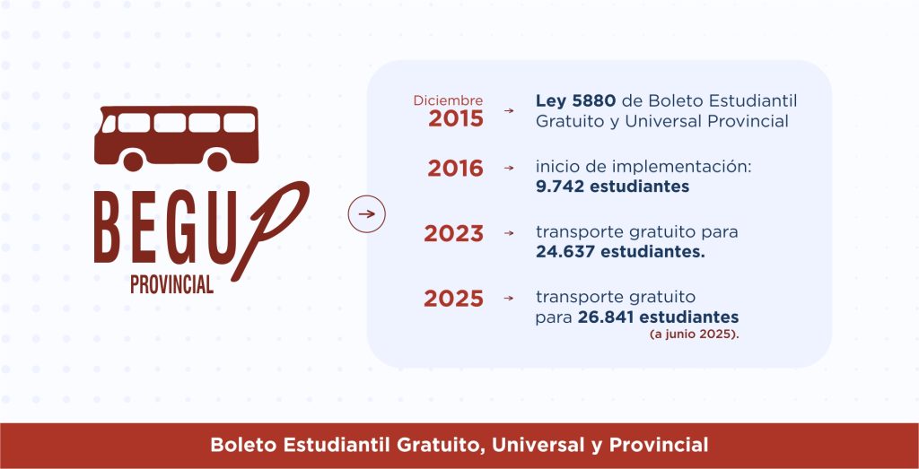 Desde la implementación de la Ley Provincial N° 5880, que establece el BEGUP, niños, niñas, adolescentes y adultos estudiantes de nivel primario, secundario, terciario y universitario, que asisten a instituciones educativas, pueden viajar gratis en transporte público.