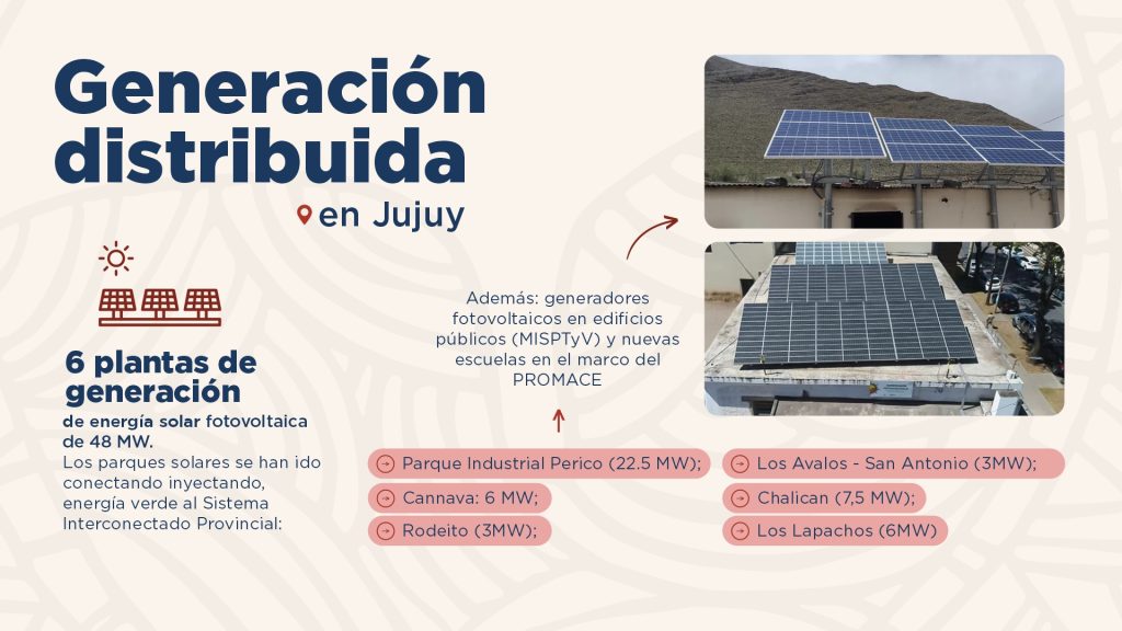 Desde 2020, se inyecta energía eléctrica renovable al Sistema Nacional Interconectado. El 100 % de la producción de energía de las tres plantas generadoras está vendida a CAMMESA por 20 años. Con su renta se construyen escuelas. Está prevista la ampliación en 240 Mw del parque solar, lo que equivale a 1.000 puestos de trabajo para los jujeños.