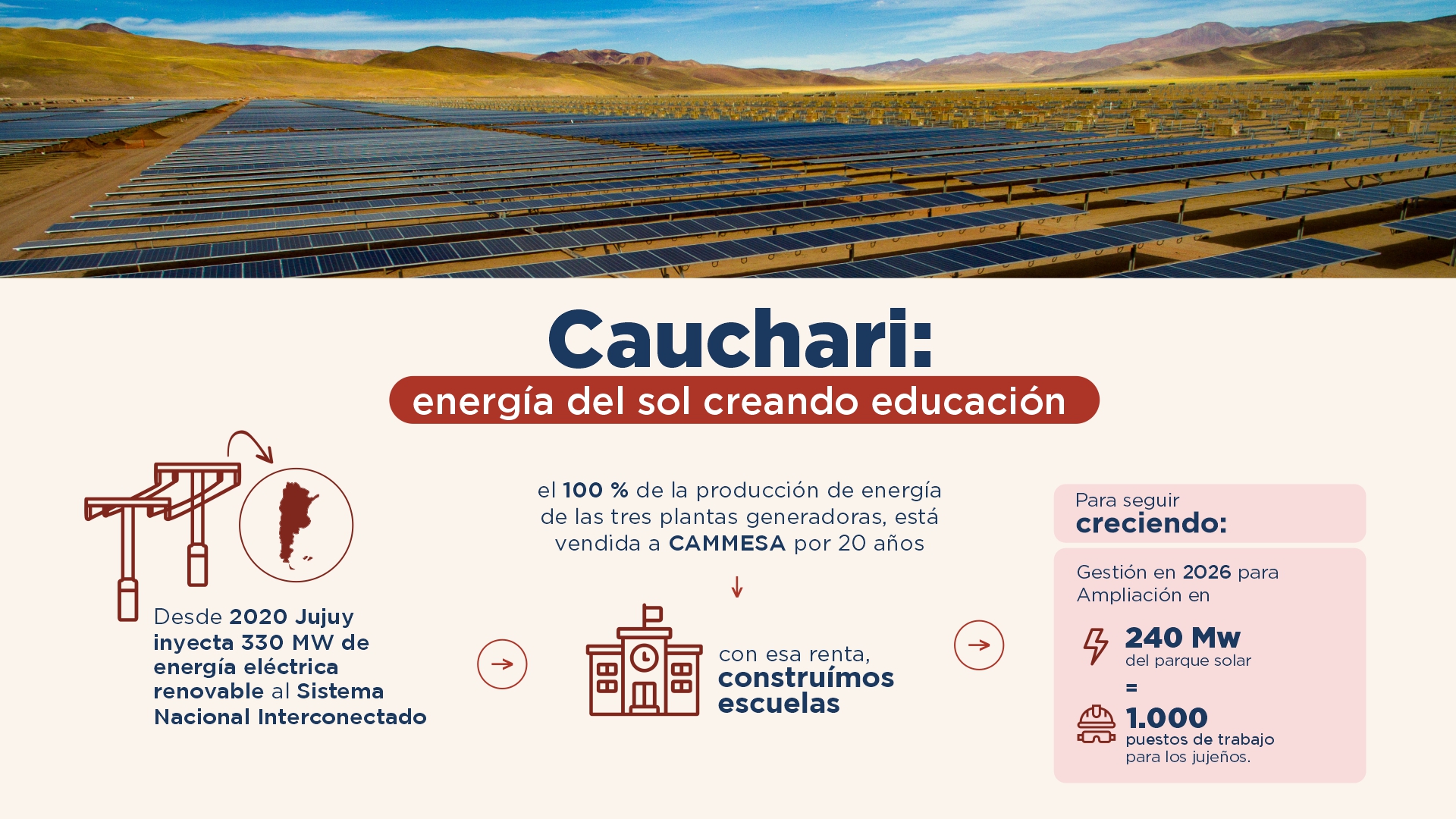 Desde 2020, se inyecta energía eléctrica renovable al Sistema Nacional Interconectado. El 100 % de la producción de energía de las tres plantas generadoras está vendida a CAMMESA por 20 años. Con su renta se construyen escuelas. Está prevista la ampliación en 240 Mw del parque solar, lo que equivale a 1.000 puestos de trabajo para los jujeños.