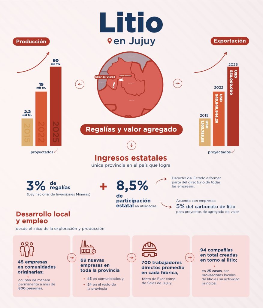Jujuy lidera una revolución minera con impacto global, sustentada en producción récord, participación estatal estratégica y generación de trabajo jujeño. Con proyectos que multiplicaron la producción de litio desde 2015 y decenas de empresas jujeñas involucradas, la provincia es hoy sinónimo de minería con valor agregado, sostenibilidad y transparencia. Regalías únicas en el país, fábricas que emplean a cientos de jujeños, acuerdos internacionales y un ecosistema científico y educativo completan un modelo que combina desarrollo con cuidado del ambiente y protagonismo estatal.