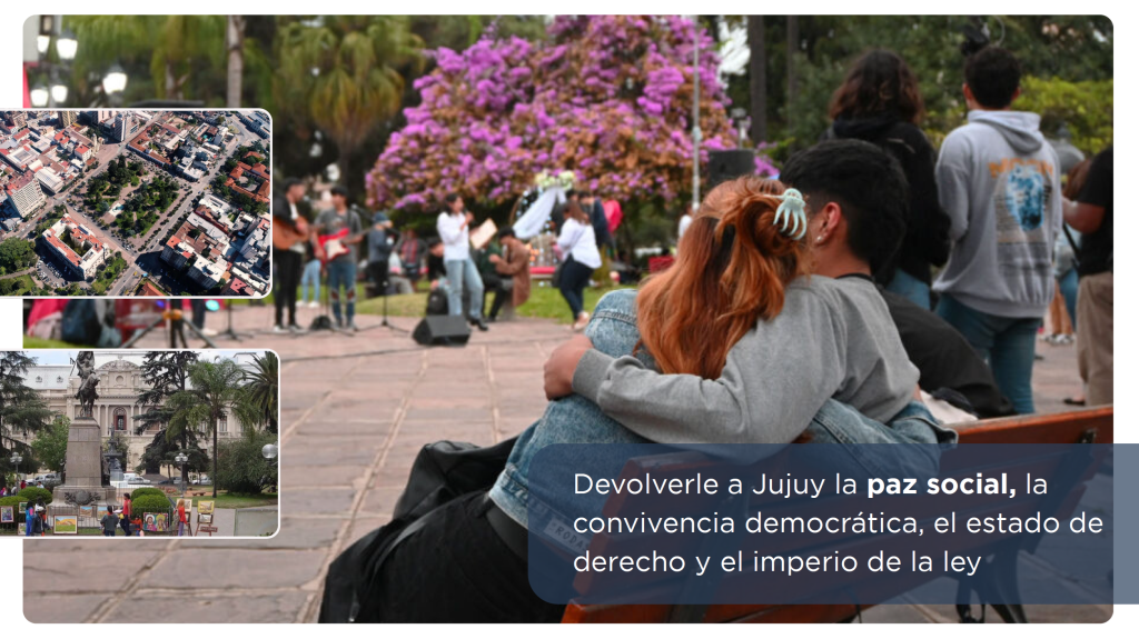 Comenzamos la reconstrucción de Jujuy y pusimos en valor la convivencia armónica en la provincia. Aseguramos que el espacio público sea pacífico para todos, y que podamos transitar por la provincia sin trabas para el desarrollo.
